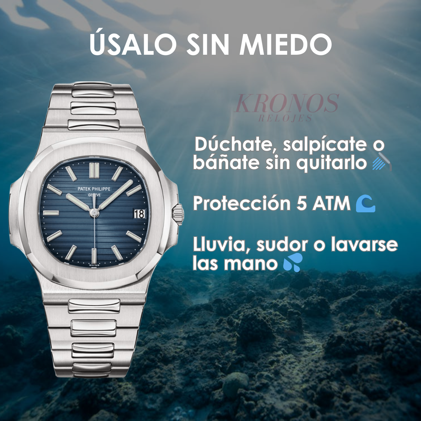 No tienes que quitártelo para vivir tu día. Soporta presión, agua y uso diario sin comprometer su funcionamiento. 5ATM.