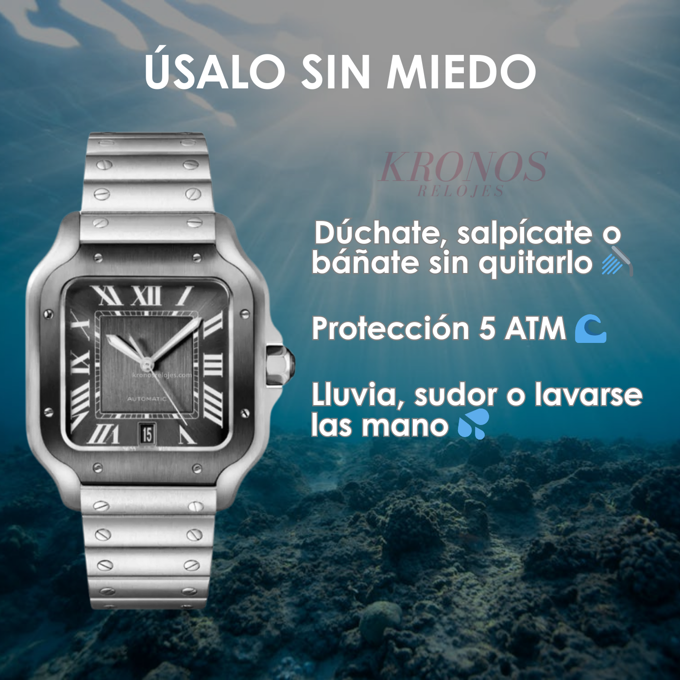 Nuestros relojes tienen una resistencia al agua de 5ATM, lo que significa que están diseñados para ser resistentes al agua en situaciones cotidianas, como salpicaduras o lluvia. Sin embargo, no recomendamos utilizarlos para nadar o bucear.