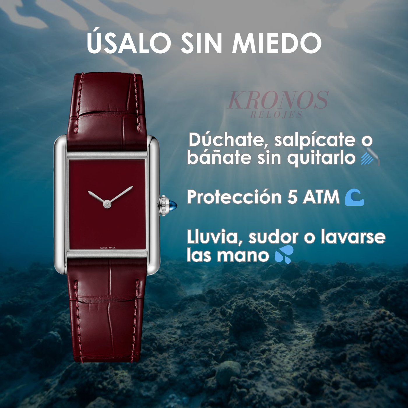 Nuestros relojes tienen una resistencia al agua de 5ATM, lo que significa que están diseñados para ser resistentes al agua en situaciones cotidianas, como salpicaduras o lluvia. Sin embargo, no recomendamos utilizarlos para nadar o bucear.